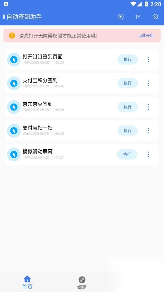 2、无需复杂设置,通过直观的动作列表和悬浮球手势即可完成签到,新手也能快速上手。