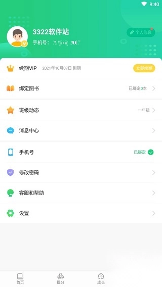 4、点击成长一栏可以查看成绩记录,平均成绩,并将成绩以统计图的形式直观展现出来
