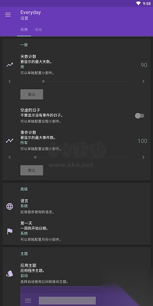 各种设置可根据需求定制。比方:日历、第一天、天数、事情数、事情指示器、事情可见性等。