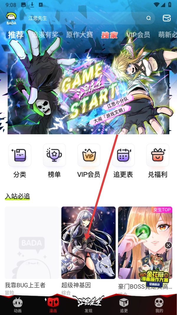 1、在首页点击【漫画】,进入漫画推荐页面。