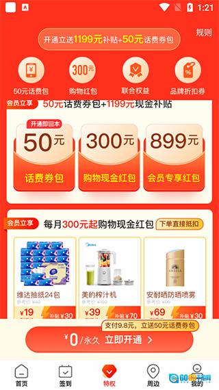 50 元手机话费套餐、购物红包福利、联合会员权益、品牌专属折扣券