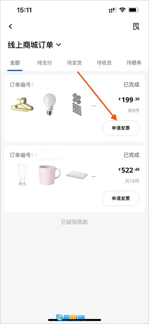 2. 进入订单页面,点击订单右下角的“申请开票”。