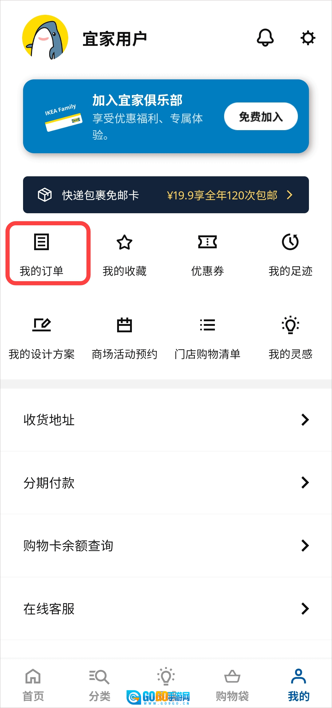 1. 打开宜家家居网上商城,于“我的”页面点击“我的订单”。