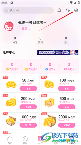 2、当进入个人中心界面后,需点击右上角的齿轮图标。