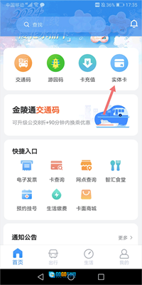 3、要是没有实体卡,可在首页点击【金陵通交通码】,申请电子公交卡,申请成功后就能在线完成充值操作。