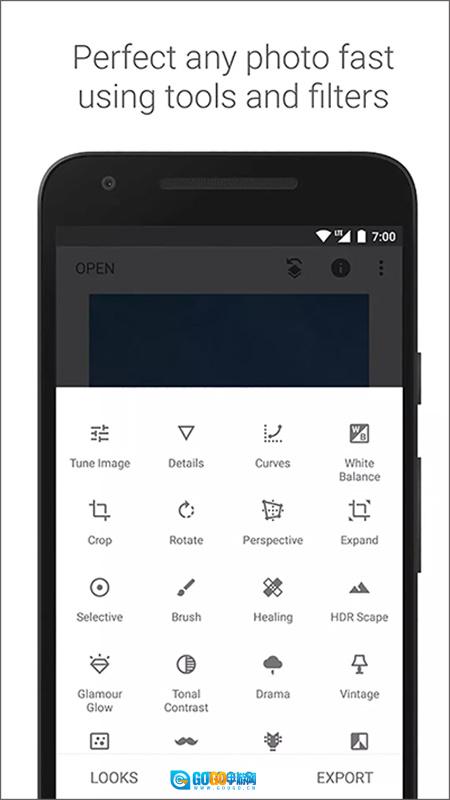 1、Snapseed这款手机修图软件能够打开JPG与RAW文件。