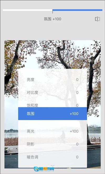 请选中“调整图片”滤镜,接着把氛围与高光数值均提升到100,如此操作,图片不仅能被调亮,阴影部分也不会损失。