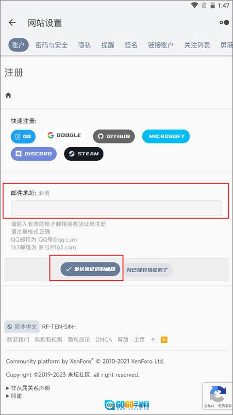 3、于注册界面填入邮件地址,接着点击下方的“发送验证码到邮箱”按钮。