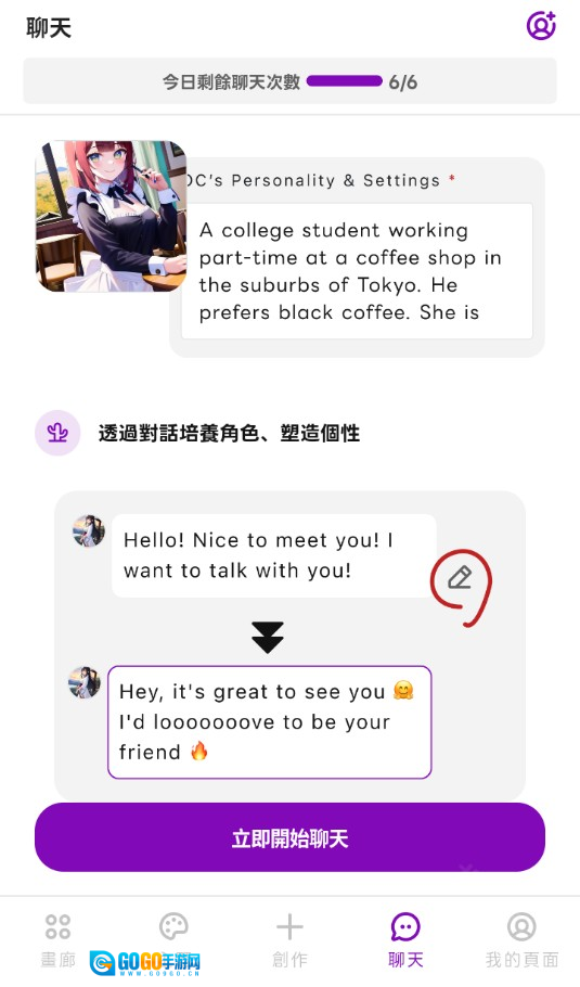 定制您OC的个性与台词,和它们畅快聊天。此外,您还能将自己的OC分享给其他用户。
