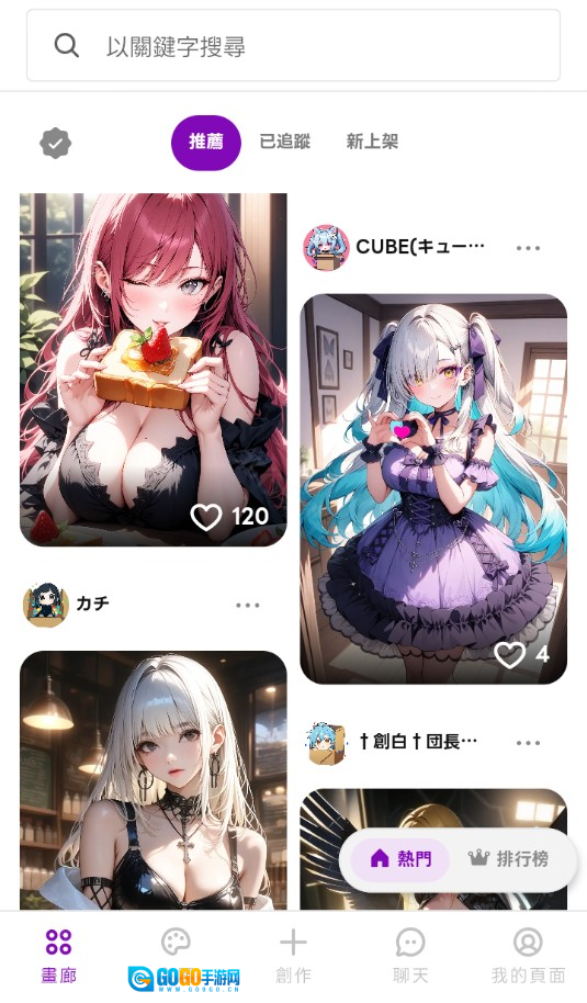 4、在【画廊】里,有其他用户分享的原创角色(OC)。你能够收藏自己喜爱的图片,还能关注相关的作者。