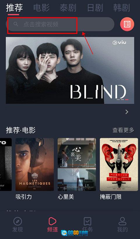 1、在“频道”页面上方的搜索框输入你想要搜索的剧名。
