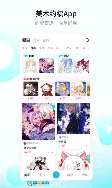 画加,这是一个趣味十足的二次元同人美术平台,同时也是一款实用性颇强的约稿、接稿软件。在画加,你既能以太太的身份,挂出风格各异的橱窗承接画稿;也能作为约稿人,在众多精美的橱窗里挑选心仪的进行约稿。不仅如此,在画加还能欣赏各路神仙太太的佳作,与约稿对象实时展开交流互动。当然,你也可以在此发布自己的作品,收获他人的夸赞与中肯评价。