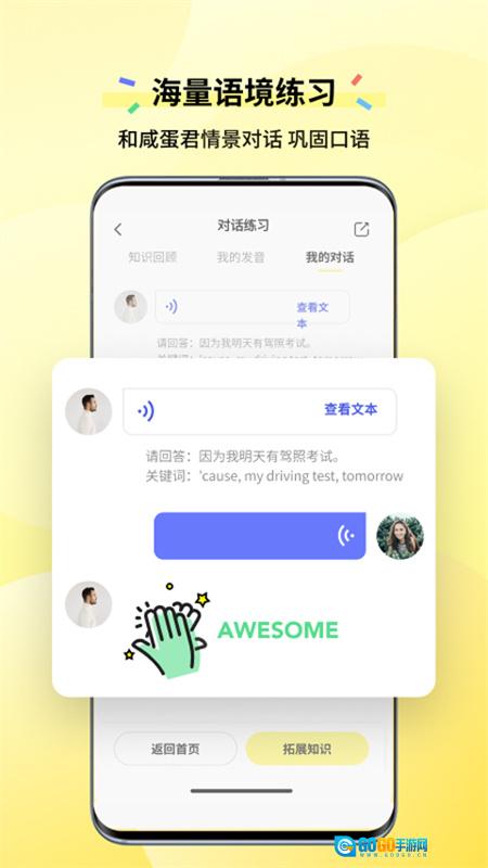 咸蛋口语非常契合中国人的学习思维习惯与教育体系,其强大的口语学习功能涵盖智能评分、发音纠错和场景联系等。搭配智能化课程,能助你快速达成学习需求。
