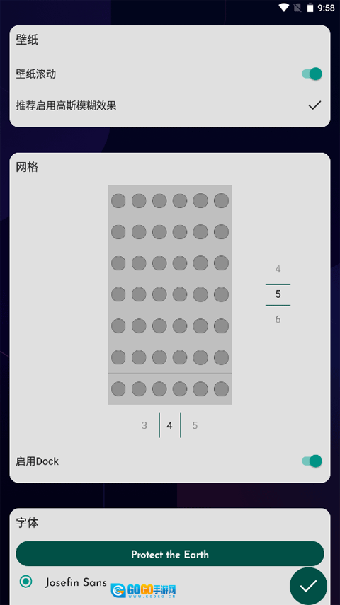 1. 开启DNA桌面正版,对壁纸滚动、高斯模糊效果、网格形式以及字体等进行设置,然后点击右下角的“√”。