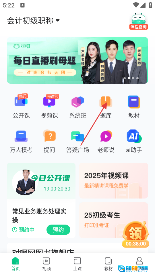 1. 在首页,点击【题库】这一选项,就能进入初级会计实务的题库界面。