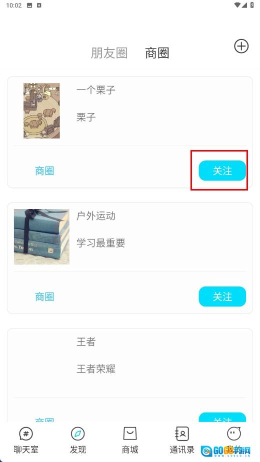 2、在商圈页面选择感兴趣的商圈条目,点击【关注-功能按钮】。