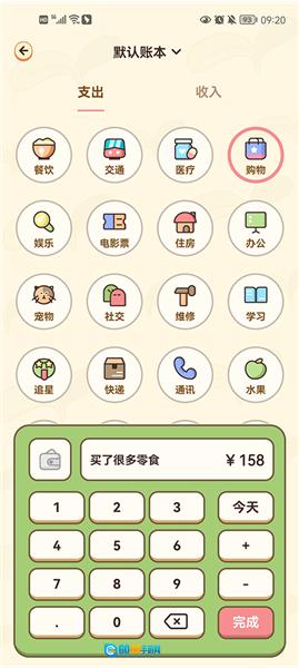 3、比如今天去超市购买了很多东西,那你就可以点击购物,备注一下金额用途,在输入金额和时间即可;