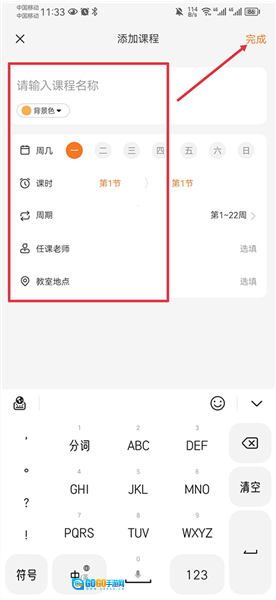 4. 最后,完善课程名称、周几、课时、任课老师、教室地点等相关信息,点击“完成”就可以了。