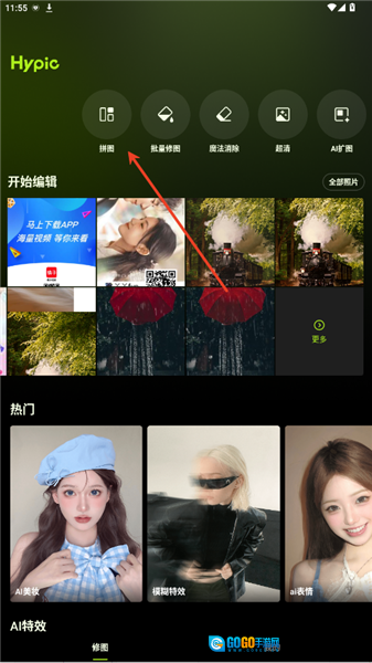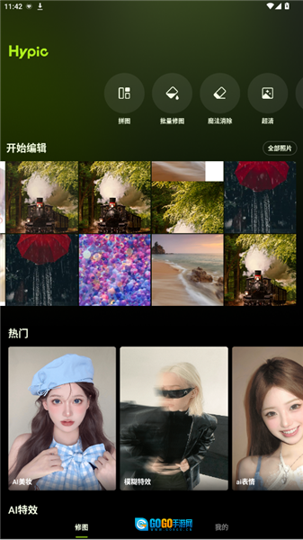 1. 点击打开hypic,便能看到首页的功能布局。在此页面,既可以点击中间的【拼图】【批量修图】【我的项目】【消除笔】,也能够点击【+导入】,从而进入修图页面。