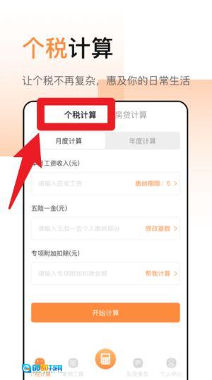 2、切换顶部标签到个税计算,可选择月度或年度模式,输入工资收入、五险一金及专项附加扣除等数据后。
