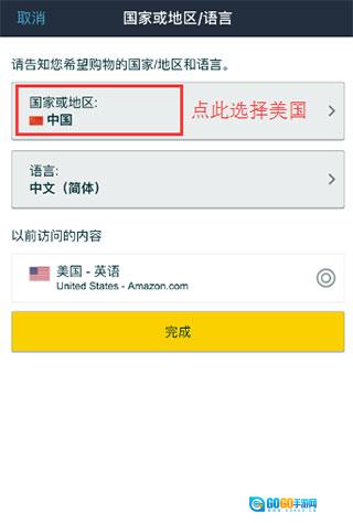 3、点击“国家或地区”选项,下拉选择“美国”。目前美国亚马逊支持英语及西班牙语两种语言,在选择国家后会自动弹出语言选择,勾选“英语”选项。完成设置后点击保存就可以进入美国亚马逊了。