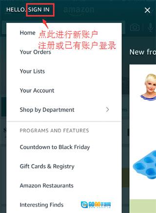 4、同样点击左上角进入设置页面,点击“SIGN IN”进入账户注册,已有美国亚马逊账户也可以点此进行登录。