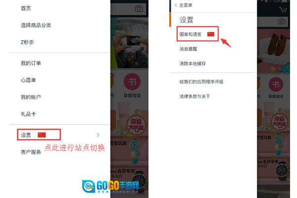 2、在左上角弹窗中找到“设置”,进入“国家和语言”设置,进行站点及语言切换。