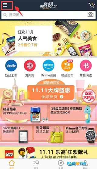 1、打开亚马逊购物软件后默认为中国亚马逊,点击左上角进入设置页面。