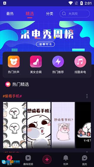 4、完成登录后,在“主页”的精选板块中,通过下拉滑动操作,即可选择主题来电秀。