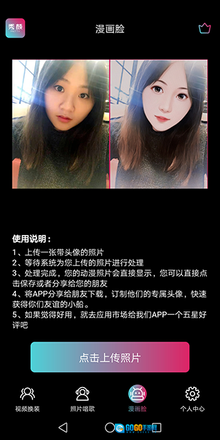 5、在漫画脸页面,能够通过上传图片或者拍照的方式,一键完成漫画脸替换操作。