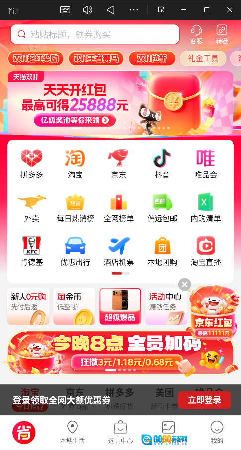 功能:整合了各大平台的优惠活动、红包以及关键工具。