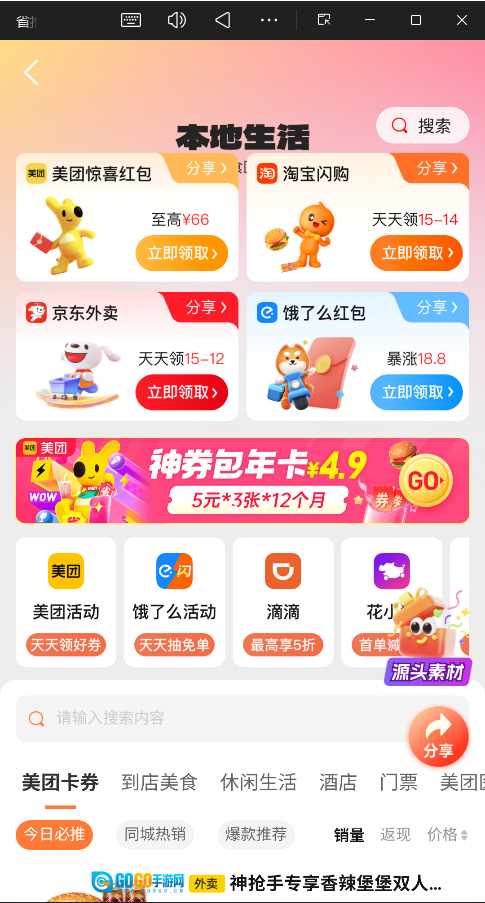 功能:对美团、饿了么等本地服务的优惠进行推广。
