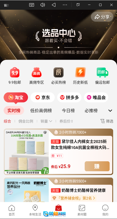 高佣商品浏览:此处罗列了全网佣金丰厚且销量出色的商品,像“9.9高佣专区”、“必买热榜”之类。