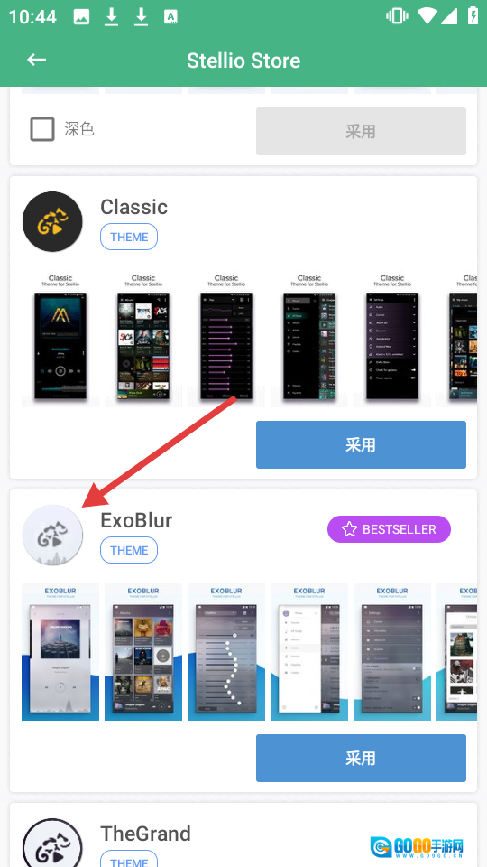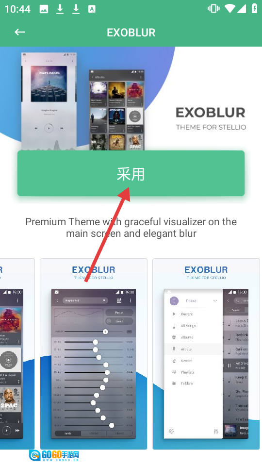 4、于ExoBlur主题详情页面里,点击【采用】按钮来应用此主题。