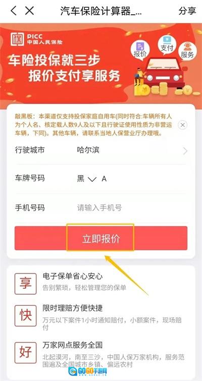 3. 填入对应的城市、车牌号、手机号等相关信息,接着点击“立即报价”,通过这些操作来完成车险的投保流程。