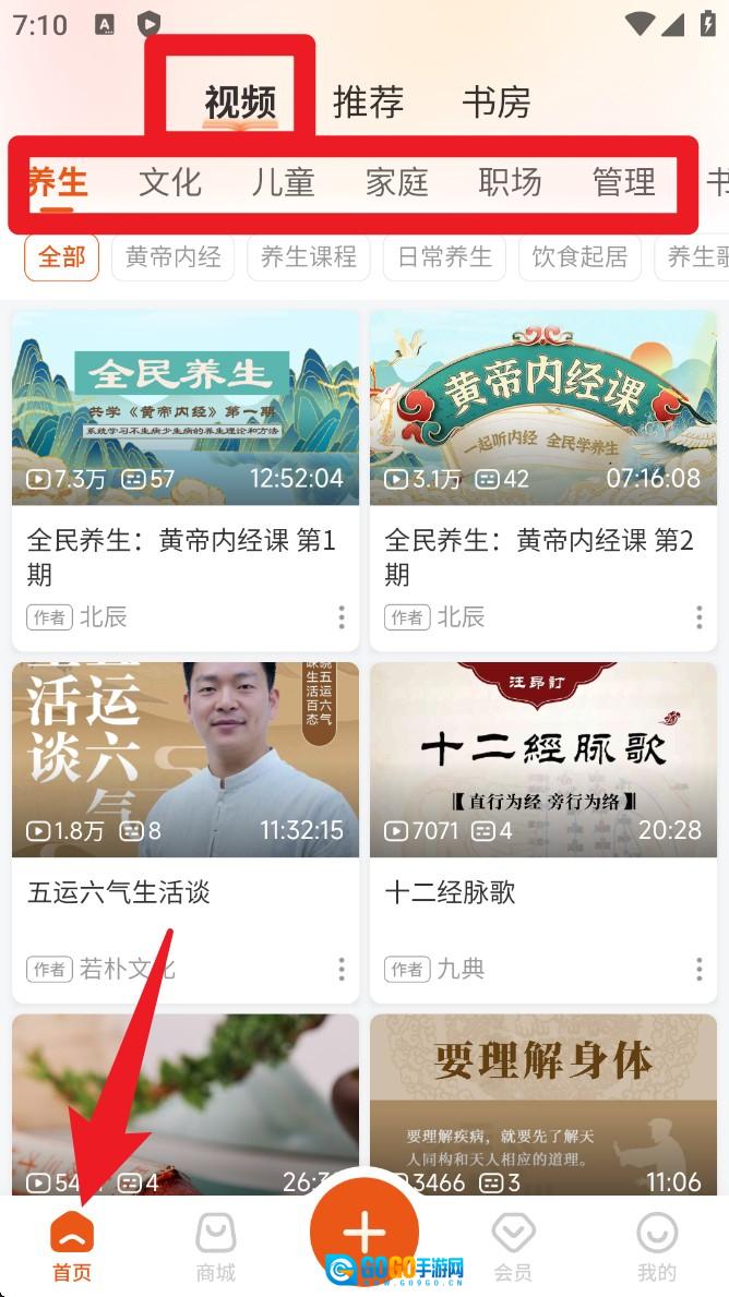 1. 点击底部的“首页”,进入主界面后,能够切换顶部的视频、推荐等频道,还可在下方浏览各类分类内容以及推荐课程。