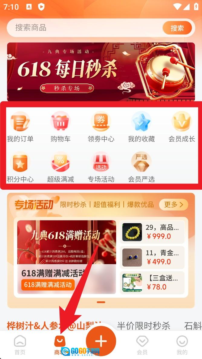3. 点击下方的商城图标,进入九典电商专场,在这里能够浏览当前的促销活动、商品推荐以及会员专属福利等内容。