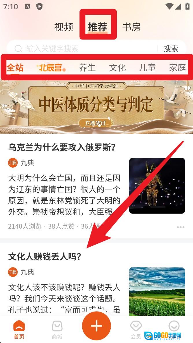 2. 切换到推荐标签页面,在这里你既可以查看文章内容和图文资讯,还能根据自身兴趣,点击上方的分类标签,比如北辰宫、养生、文化等等。