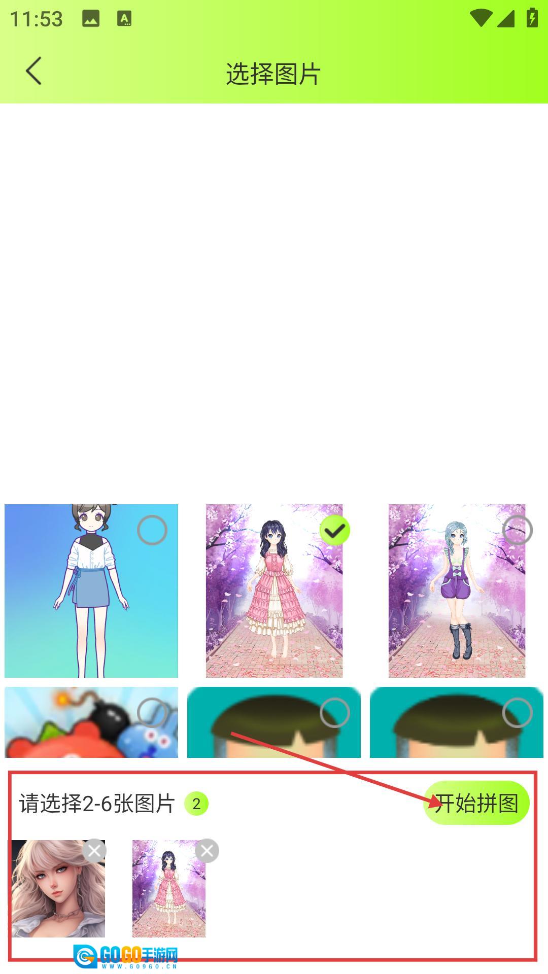 2. 当进入选择图片的界面之后,从中挑选2 - 6张图片。待挑选完毕,点击【开始拼图】,就能生成拼接长图。