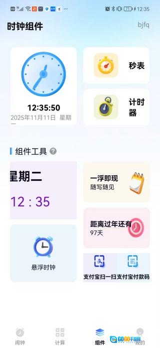 4、组件页面包含秒表、计时器、时钟、浮即现以及悬浮时钟等内容。