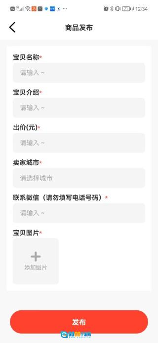 3、进入卖闲置功能的商品发布页面,依次填写宝贝名称、宝贝介绍、出价、卖家城市、微信,添加宝贝图片后,点击发布即可。