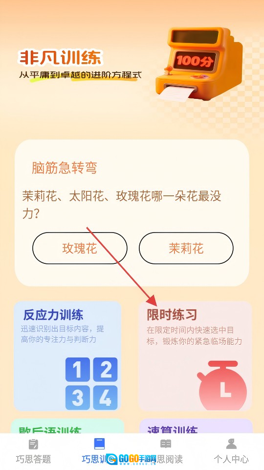 2. 于巧思训练页面,点击【限时练习】,即可进入限时训练页面。