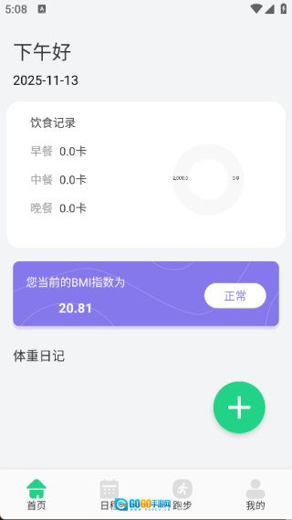 3. 在主页面,你能够看到饮食记录、当前BMI以及体重日记等功能。