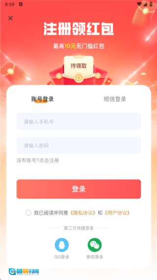 4、登录页面支持账号登录,同时也提供手机短信登录的操作方式。