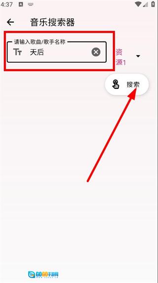 2、在音乐搜索器页面,输入歌曲或歌手名称后,点击搜索。