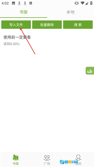 1. 在书架页面,轻点【导入文件】按钮,便能进入文件导入选择界面。