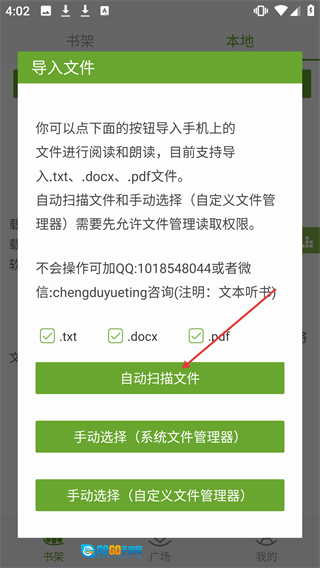 2. 在导入文件的弹窗里,点击【自动扫描文件】选项,就能自动扫描手机内支持的文件。