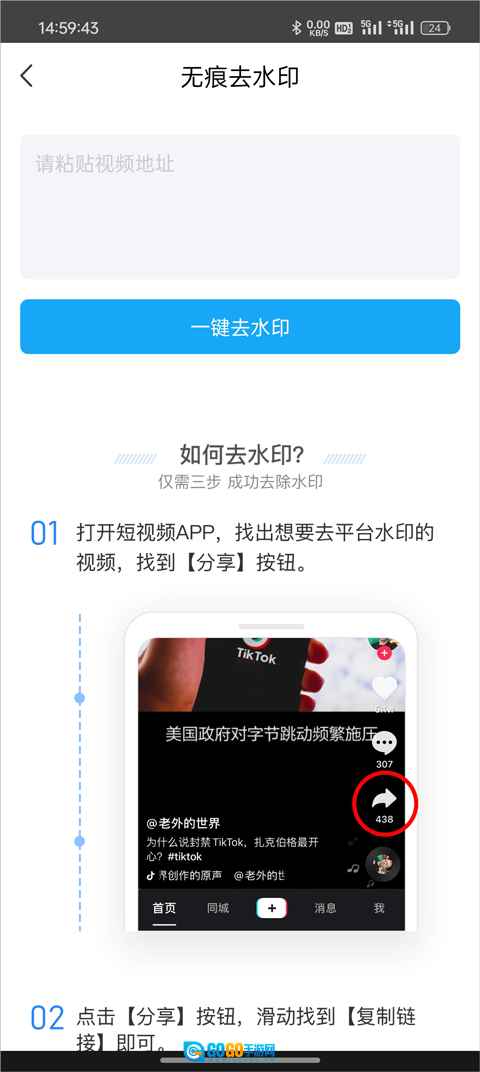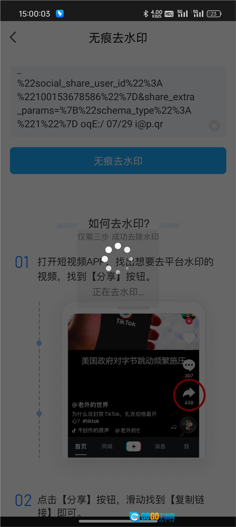 2. 打开抖音,复制你想去除水印的视频链接,然后把该链接粘贴至输入框内。