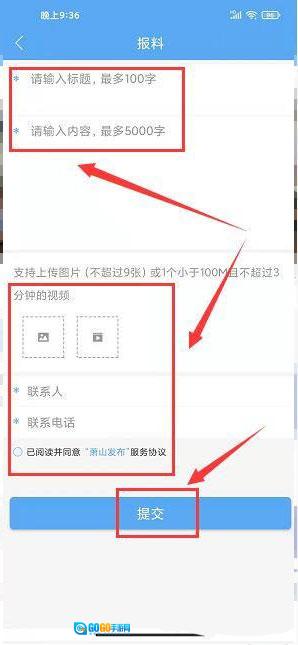 进入报料界面,输入标题、内容描述、上传图片或视频、联系人、联系电话、勾选已阅读并同意“萧山发布”服务协议,点击【提交】。