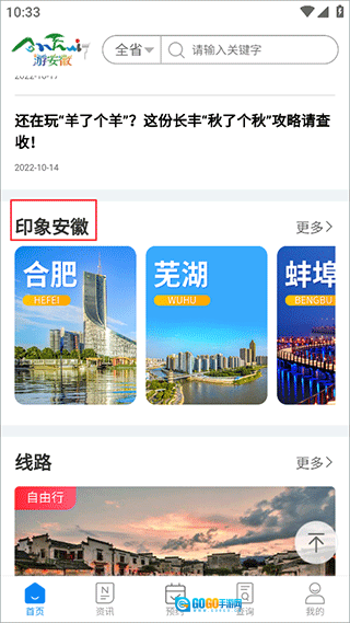 2、在首页向下滑动,找到“印象安徽”板块,从中挑选你想要深入了解的城市并点击进入,这里以合肥为例。